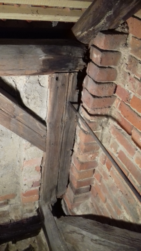 In der Ecke der Scheune ist Lochfraß im tragenden Holz. Um das zu reparieren müsste man das Sparrenfeld am Giebel abdecken, von Dachlatten befreien, den Giebelsparren anheben, die Fußpfette anheben und in eingebautem Zustand anlaschen, den Pfosten vom Drempel ausbauen, zwei Maueranker vom Holz lösen, das Lagerholz des Giebelgebindes im eingebauten Zustand anlaschen und das letzte Stück des Auflagerholzes der Deckenbalken ersetzen.