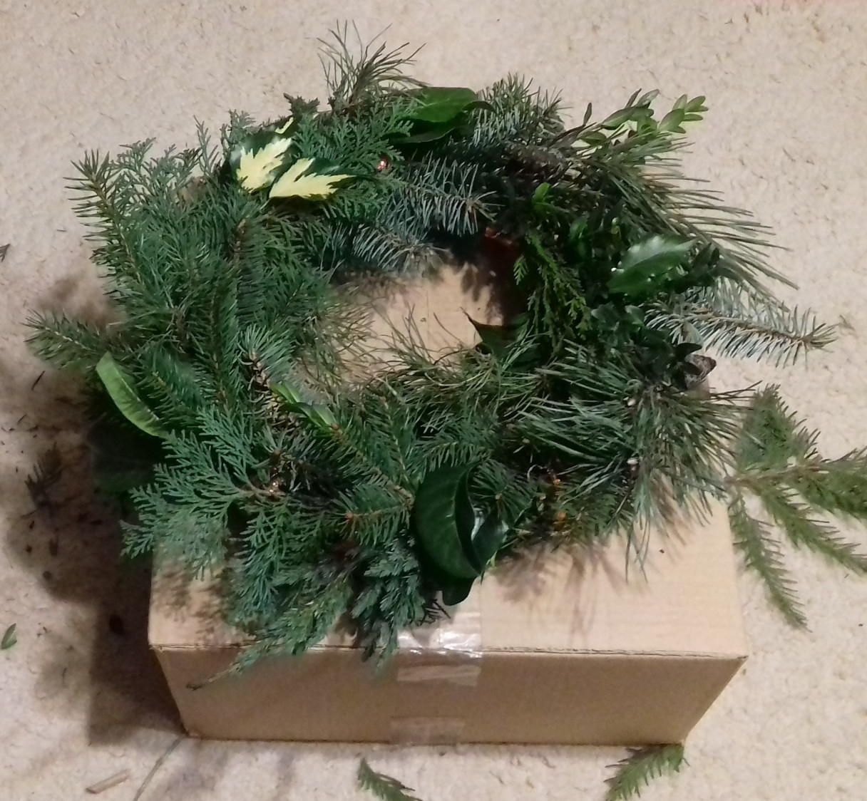 Adsventskrantsversuch. Man muss Forsythie nehmen. Nicht die Haselnuss, Forsythie. Der einfache Reisigkranz sieht ganz gut aus. Mit Grün bebunden erinnert er an eine Dornenkrone. Vielleicht daher der Brauch.